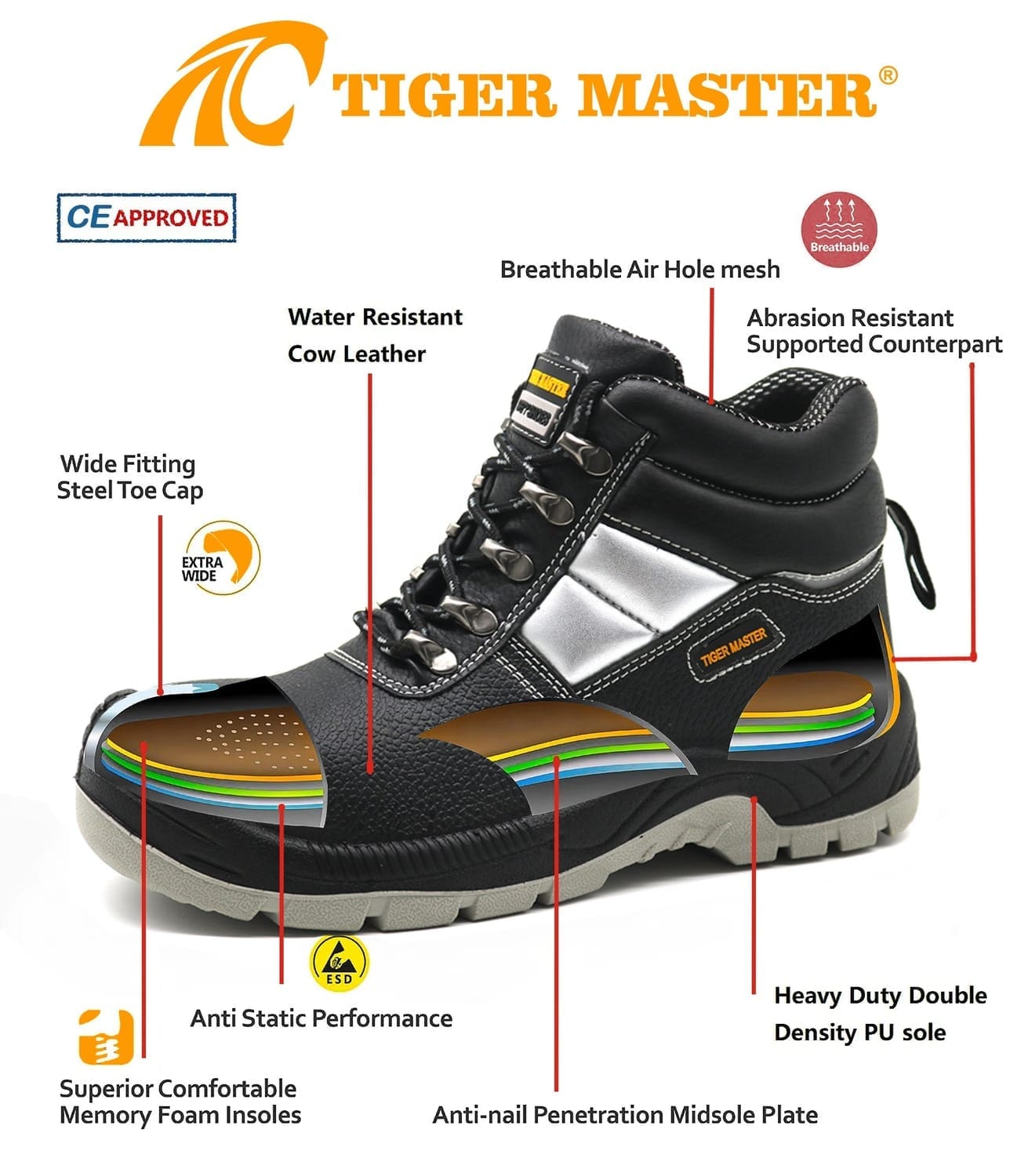 Tiger Master Bottes de sécurité antidérapantes résistantes à l'huile et à l'eau, chaussures de travail anti-perforation à embout en acier pour hommes, chaussures de sécurité industrielles S3 SRC